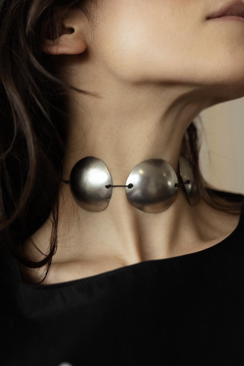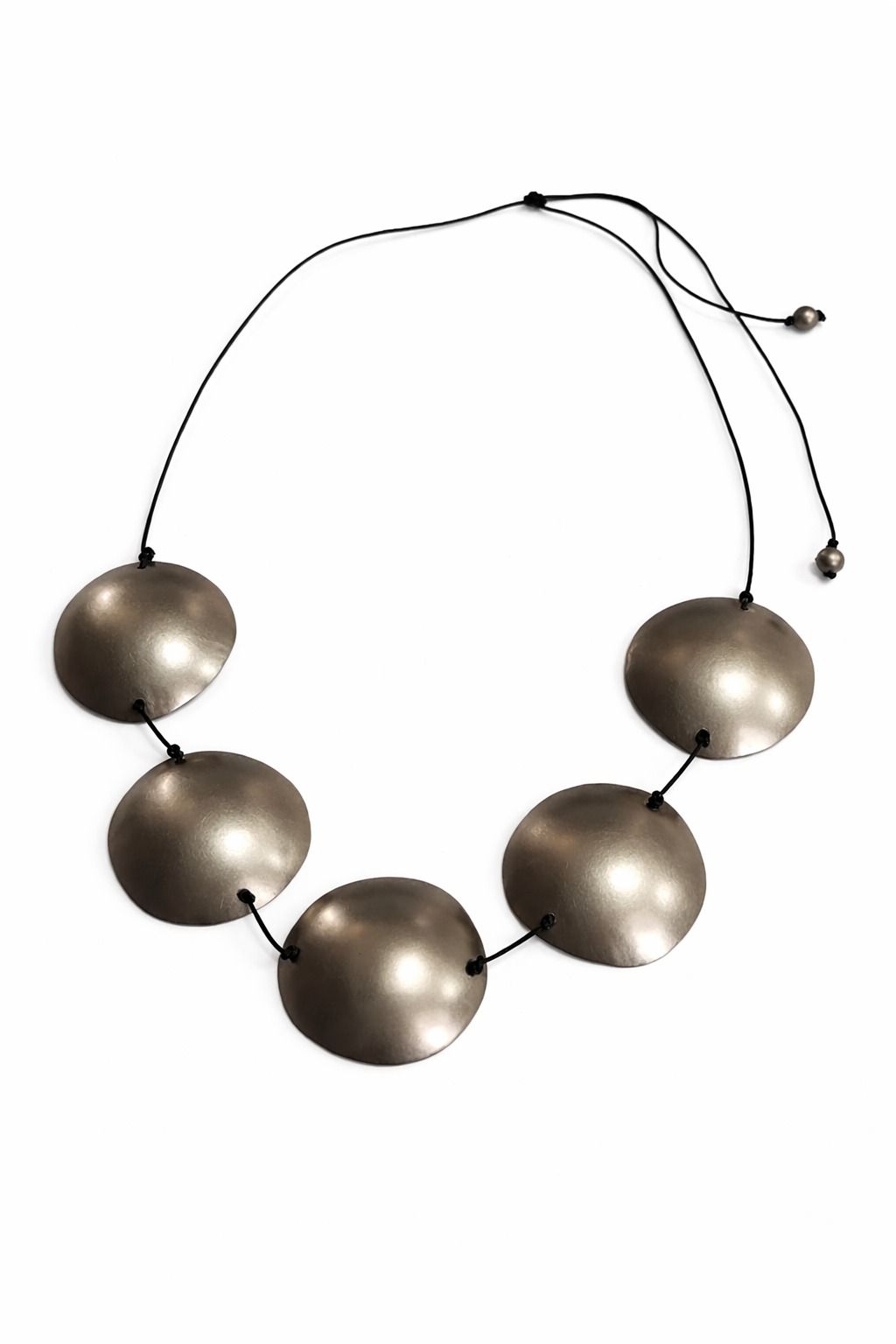 COLAR CURTO DE CORDÃO COM BOLAS DE METAL PRATA ENVELHECIDA. FECHAMENTO EM NÓ.