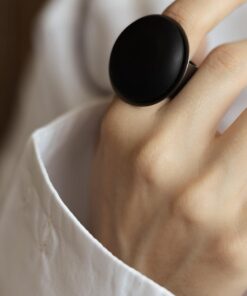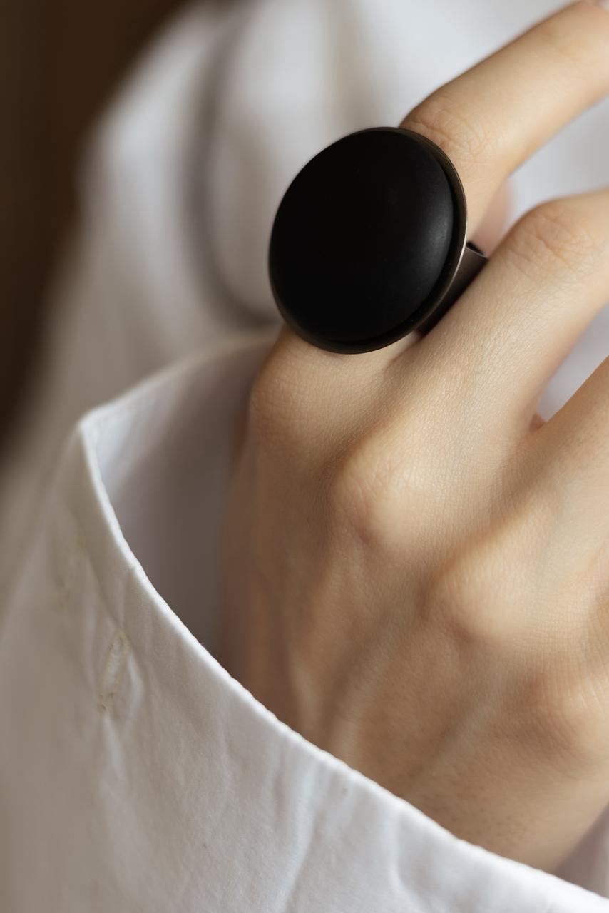 ANEL GRANDE DE METAL PRATA ENVELHECIDA COM CENTRO DE COURO. TAMANHO REGULÁVEL.