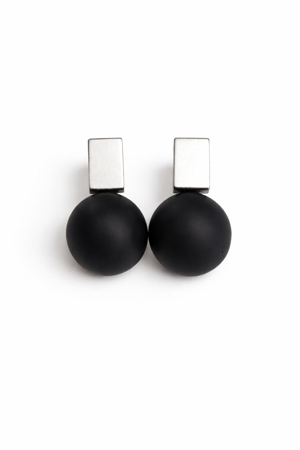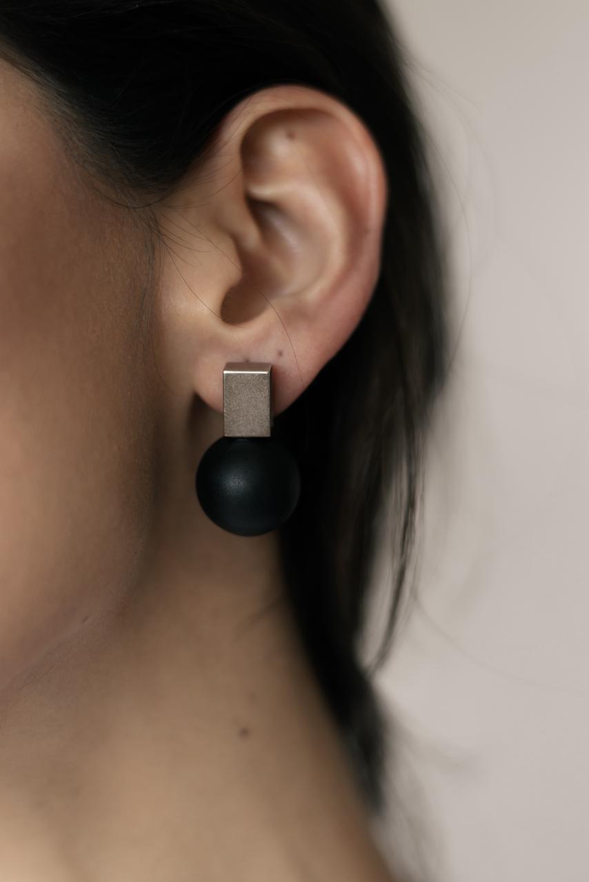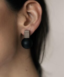 BRINCO DE METAL PRATA ENVELHECIDA COM BOLA DE RESINA PRETA.