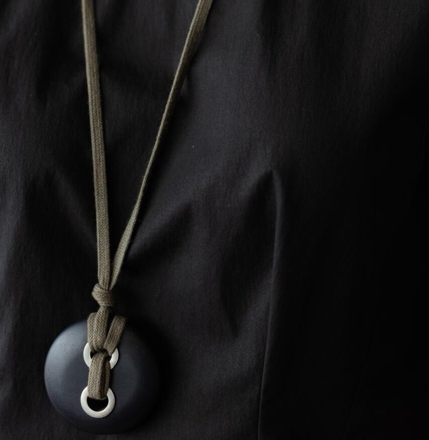 COLAR LONGO DE CORDÃO COM RESINA E DETALHES EM METAL PRATA ENVELHECIDA. CORDÃO QUE PERMITE AJUSTE NO TAMANHO.