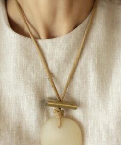 COLAR CURTO DE CORDÃO COM DETALHE EM METAL OURO VELHO E RESINA OFF WHITE. CORDÃO COM NÓ QUE PERMITE AJUSTE NO TAMANHO.