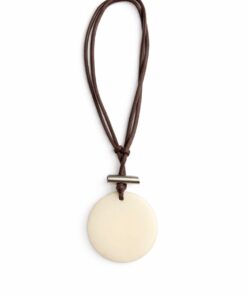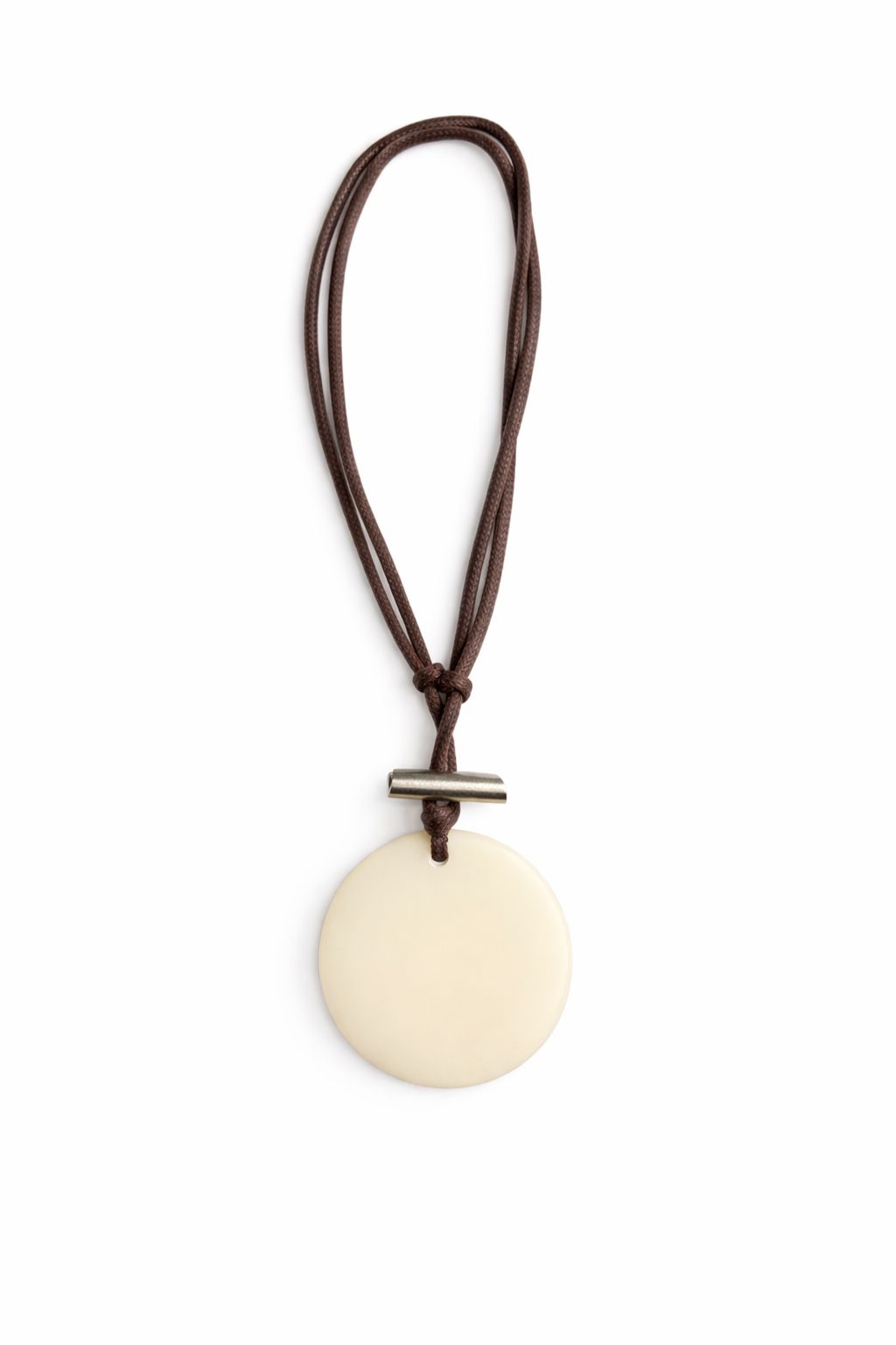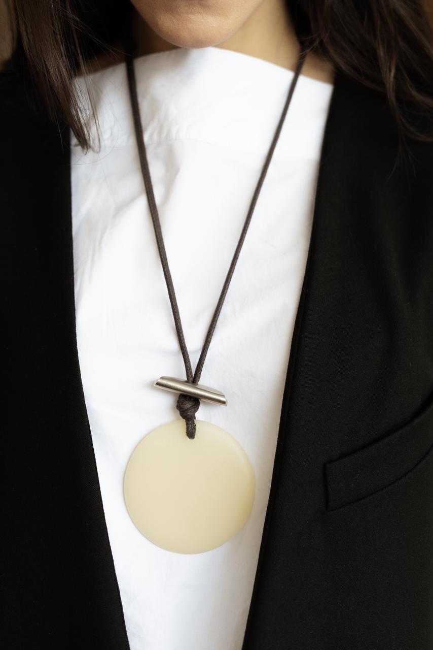 COLAR LONGO OU CURTO COM CORDÃO DE AJUSTE. DETALHE DE METAL PRATA ENVELHECIDA E PEÇA DE RESINA OFF WHITE.