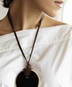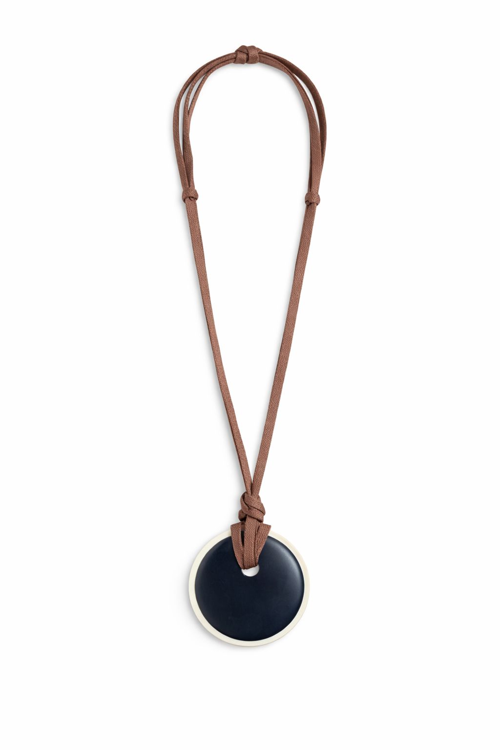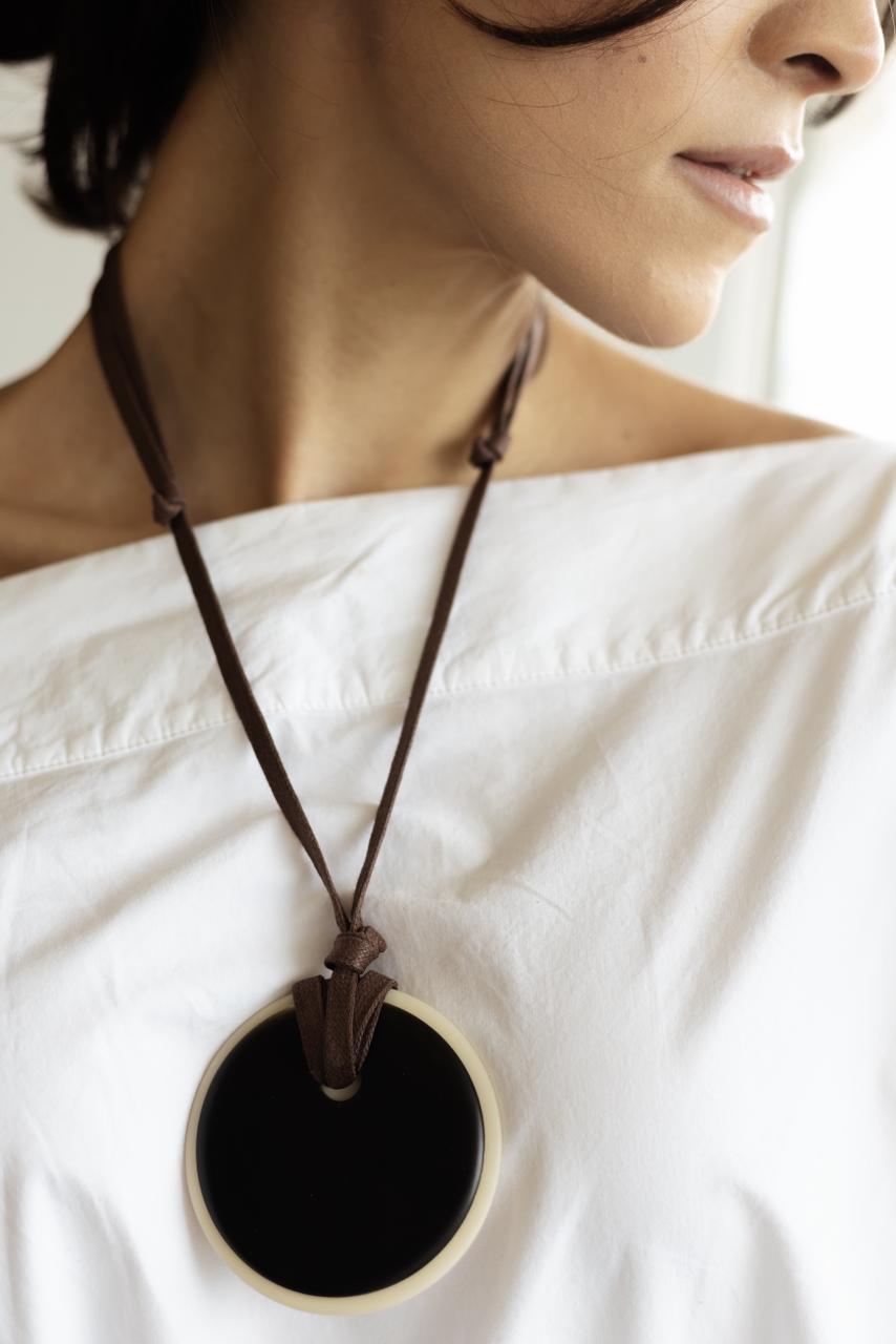 COLAR DE TAMANHO VARÍAVEL, POSSUI CORDÃO QUE PERMITE O AJUSTE NO TAMANHO. SOBREPOSIÇÃO DE PEÇAS DE RESINA.